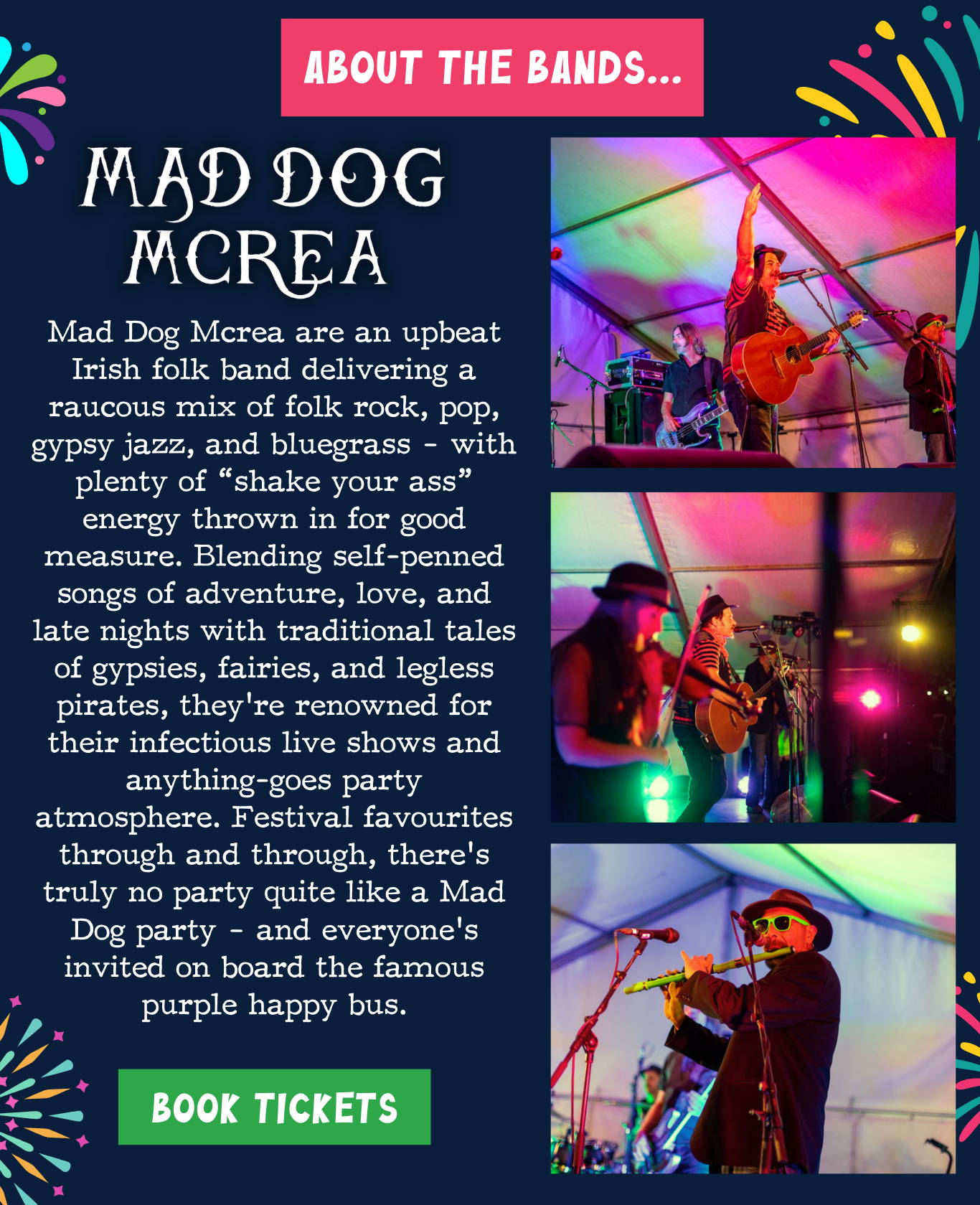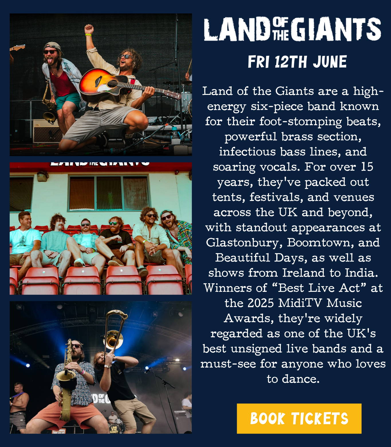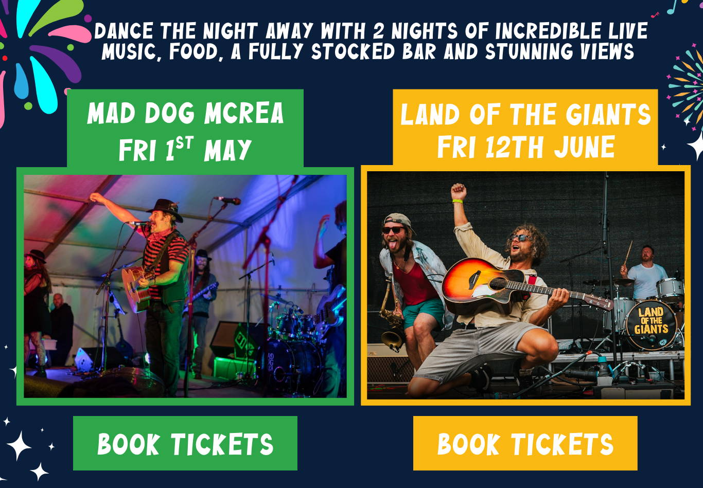 We’re bringing you two incredible headline acts: the high-energy brass-fuelled sounds of Land of the Giants and the foot-stomping, fiddle-driven party vibes of Mad Dog Mcrea. Expect big festival energy, infectious rhythms, and packed dance floors as these renowned live bands light up the stage. Our Festival Nights are all about creating a true summer festival in Devon atmosphere. With a fully stocked bar, delicious food available on site, and plenty of room for dancing under the evening sky, it’s the perfect way to experience live music in Devon.