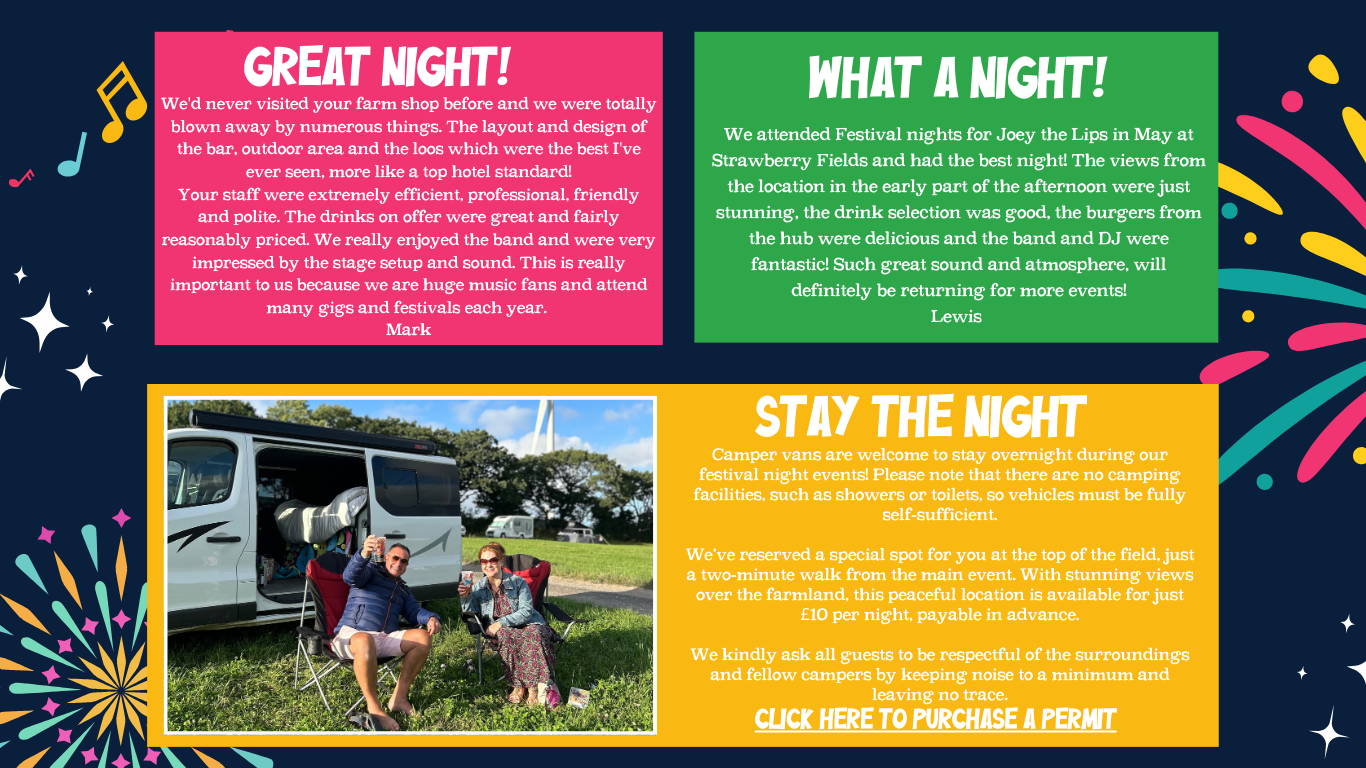Get ready for two unforgettable Festival Nights at Strawberry Fields Farm Shop, right on the Devon and Cornwall border — a summer celebration of live music, dancing, food and good times.