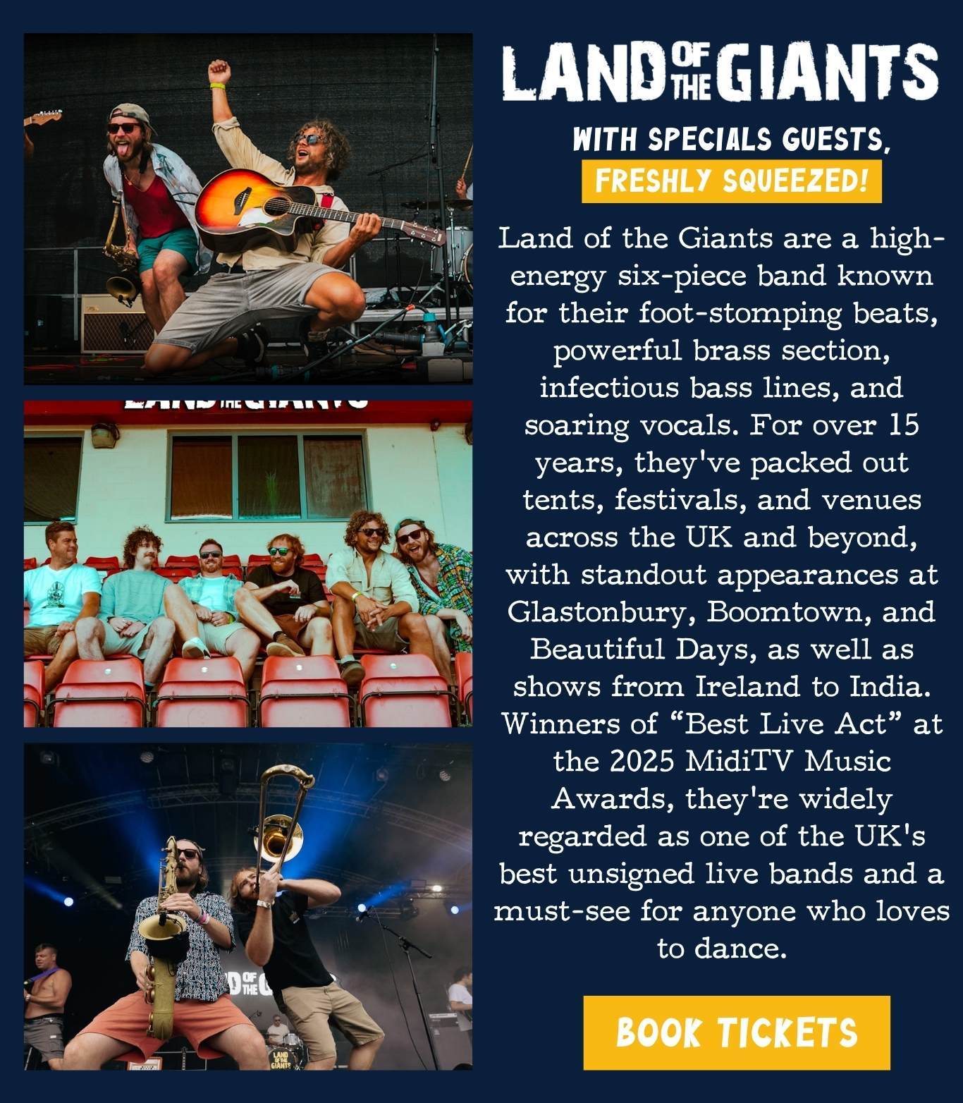 We’re bringing you two incredible headline acts: the high-energy brass-fuelled sounds of Land of the Giants and the foot-stomping, fiddle-driven party vibes of Mad Dog Mcrea. Expect big festival energy, infectious rhythms, and packed dance floors as these renowned live bands light up the stage. Our Festival Nights are all about creating a true summer festival in Devon atmosphere. With a fully stocked bar, delicious food available on site, and plenty of room for dancing under the evening sky, it’s the perfect way to experience live music in Devon.